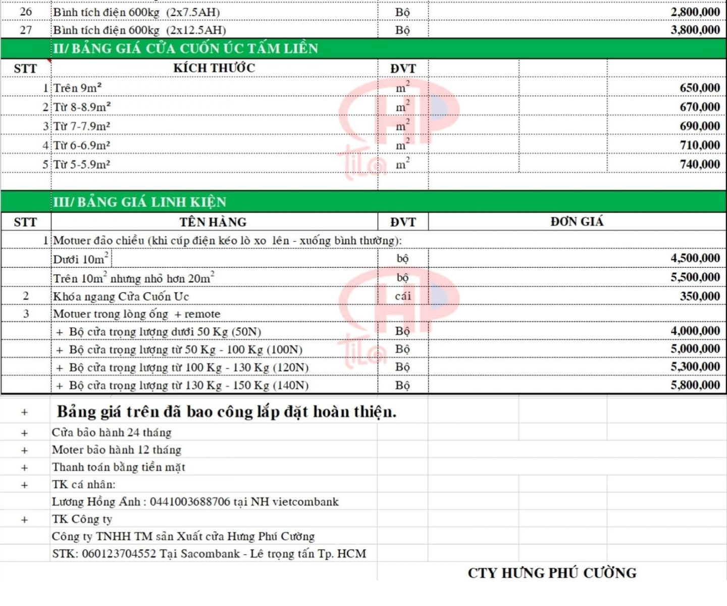 Dưới đây là bảng báo giá cửa cuốn công nghệ Đức cho bạn tham khảo, các giá trị có thể thay đổi tùy theo nhu cầu của các bạn.